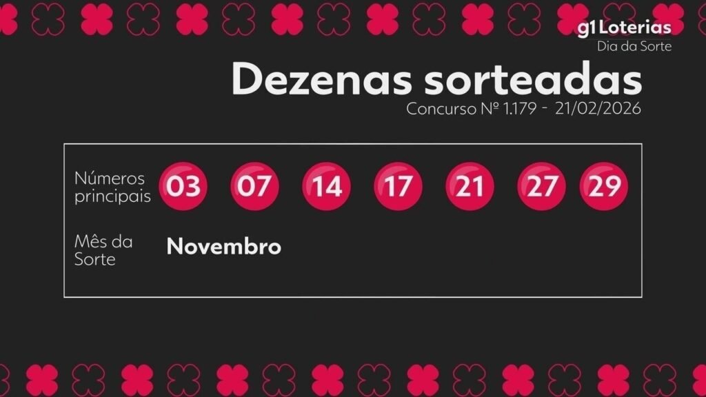 O concurso 1179 da Dia de Sorte, realizado neste sábado (21), teve seus resultados divulgados, apresentando múltiplos ganhadores em diversas faixas de premiação. Os números sorteados foram 03, 07, 14, 17, 21, 27 e 29, com o Mês da Sorte sendo Novembro.